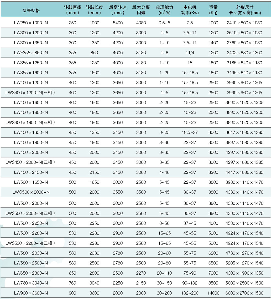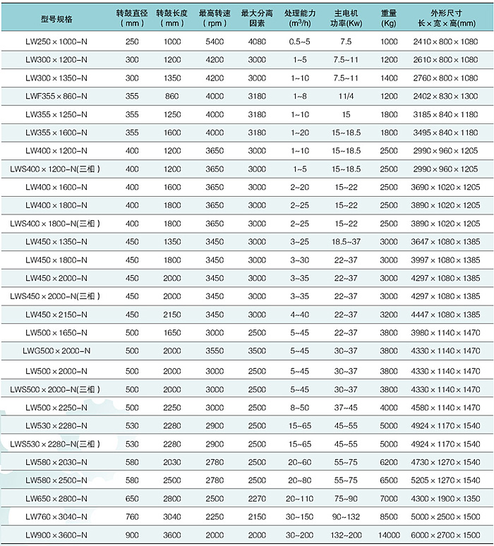 三、卸料沉降臥螺離心機(jī)的產(chǎn)品主要型號(hào)及技術(shù)參數(shù)
