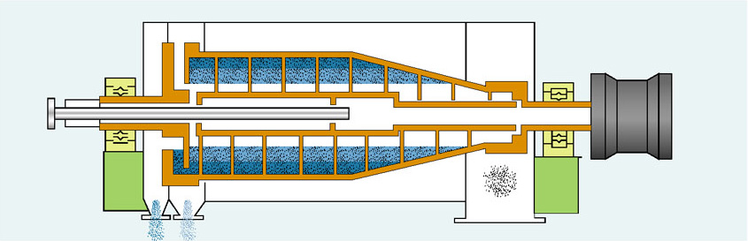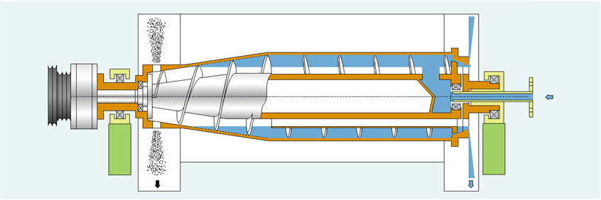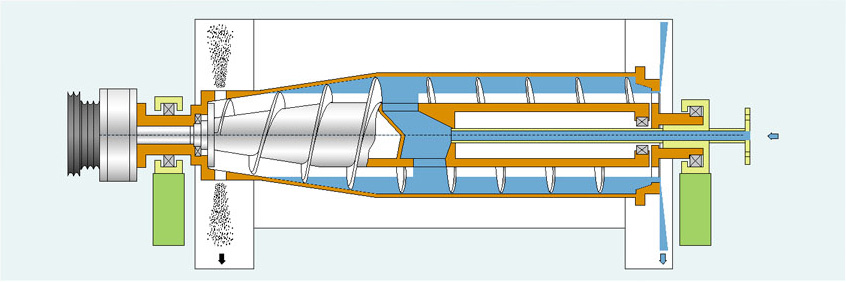 逆流型混合液進(jìn)入轉(zhuǎn)鼓后澄清液和沉渣在分離時(shí)逆向移動(dòng),分別流向各自的出口。逆流型是標(biāo)準(zhǔn)機(jī)型,適用于大多數(shù)分離場(chǎng)合。